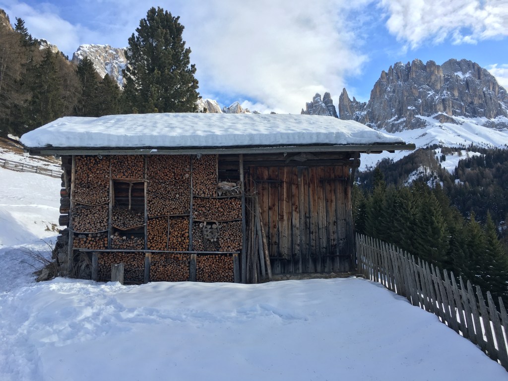 Dall’albergo, al di la della strada appena fuori l’ingresso, si trovano delle indicazioni di alcuni sentieri, per arrivare alla malga Hanigerschwaige (prima foto), bisogna seguire il sentiero 7. Si inizia salendo lungo il rio (al di là della strada) passando nel bosco, ad un certo punto si sbuca sulla strada, si oltrepassa la carreggiata proseguendo il sentiero verso l’alto. Questa malga ha la fortuna di trovarsi ai piedi delle torri del Vjolet, un insieme di 7 torri rocciose situate nel mezzo della catena montuosa del Catinaccio. Seguendo questo sentiero quindi ci si dirige verso le torri….diciamo che sono il punto di riferimento che ci accompagna per tutta la salita che dura circa due ore e mezza. Il tragitto si alterna tra boschi e prati, tutti innevati, nonostante questo, le condizioni, erano tali da poterlo percorrere senza l’uso delle ciaspole. Verso l’ultima mezz’ora di camminata ci si imbatte in due ponti di legno, magnifici! Erano stracolmi di neve!