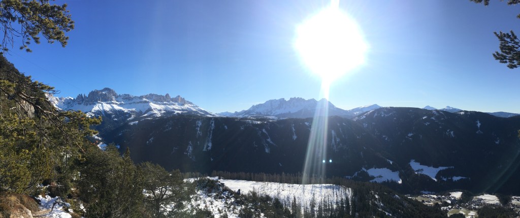 Partendo sempre dall’albergo si prendono le indicazioni del sentiero nr 4 con destinazione monte cavone (Tschafon) si oltrepassano le case del paese salendo in direzione ovest, fino a che ci si imbatte in una strada forestale. La strada forestale ci conduce a Wuhnleger, un pascolo con uno stagno piccolo, dove stanno ristrutturando una sorta di maso\rifugio, da qui si prosegue fino a che le indicazioni portano a prendere un sentiero sulla sinistra. Questo sentiero diventa molto panoramico, all’inizio all’interno del bosco ma poi la vista si apre ed è magnifica; le numerose panchine sono ottimali per godersi il paesaggio vista Catinaccio! Nell’ultimo tratto di percorso si attraversa un bosco di pino mugo che ci fa sbucare proprio sotto al rifugio di monte Cavone, che, ahimè, in questo periodo dell’anno l’abbiamo trovato chiuso.