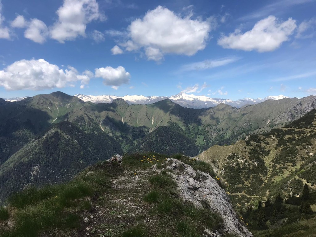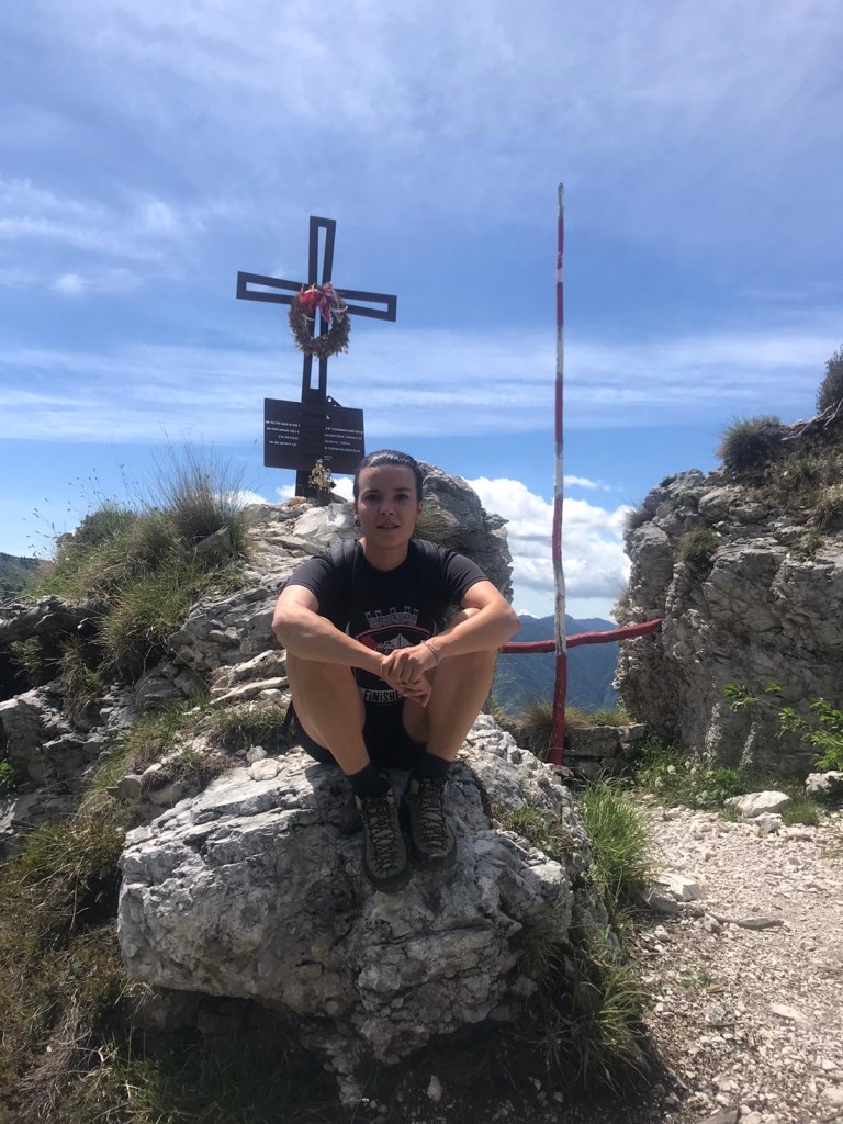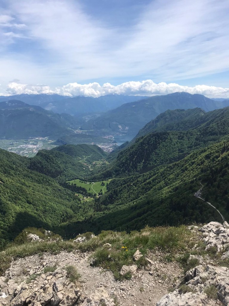 Trascorso il tempo necessario per godersi la vista e leggere i cenni storici che troviamo in questo posto torniamo indietro sul sentiero fino ad arrivare appunto al bivio del nostro sentiero segnavia 420. Il sentiero sale abbastanza rapidamente, dalla bocca di Tret mt 1581 arriveremo a Mazza di Pichea mt 1879, quindi appunto il dislivello è di circa 300 mt. Nell’ultimo tratto per arrivare alla cima troviamo un cordino di acciaio che ci aiuta e ci permette di arrivare alla croce in sicurezza. La vista da qui è mozzafiato, si vede un pezzo di lago di Garda e le cime innevate dell’Adamello, senza parlare di tutto il resto!