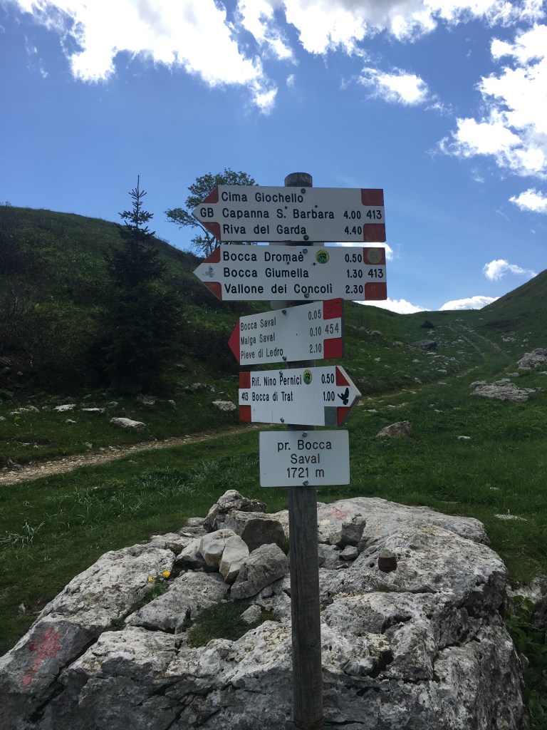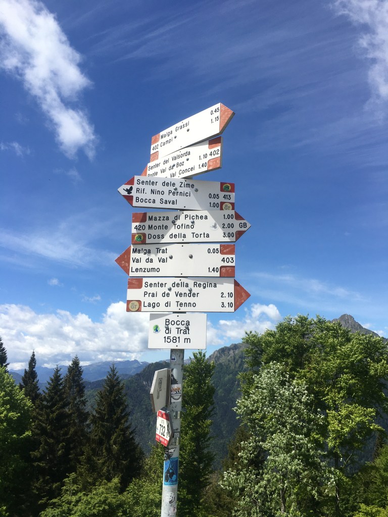 Seguiamo le indicazioni per il segnavia 402 e iniziamo la camminata all’interno del bosco, si continua sempre seguendo le indicazioni, il sentiero è segnato molto bene non si può sbagliare. Dopo circa un’ora e venti di cammino si sbuca fuori dal bosco, qui il sentiero ci porta su un grande prato pieno di dossi, questa è la bocca di Tret, il rifugio è a qualche centinaio di metri alla nostra sinistra e poi ci troviamo davanti a questo crocevia di indicazioni! insomma avete l’imbarazzo della scelta arrivati quassù.